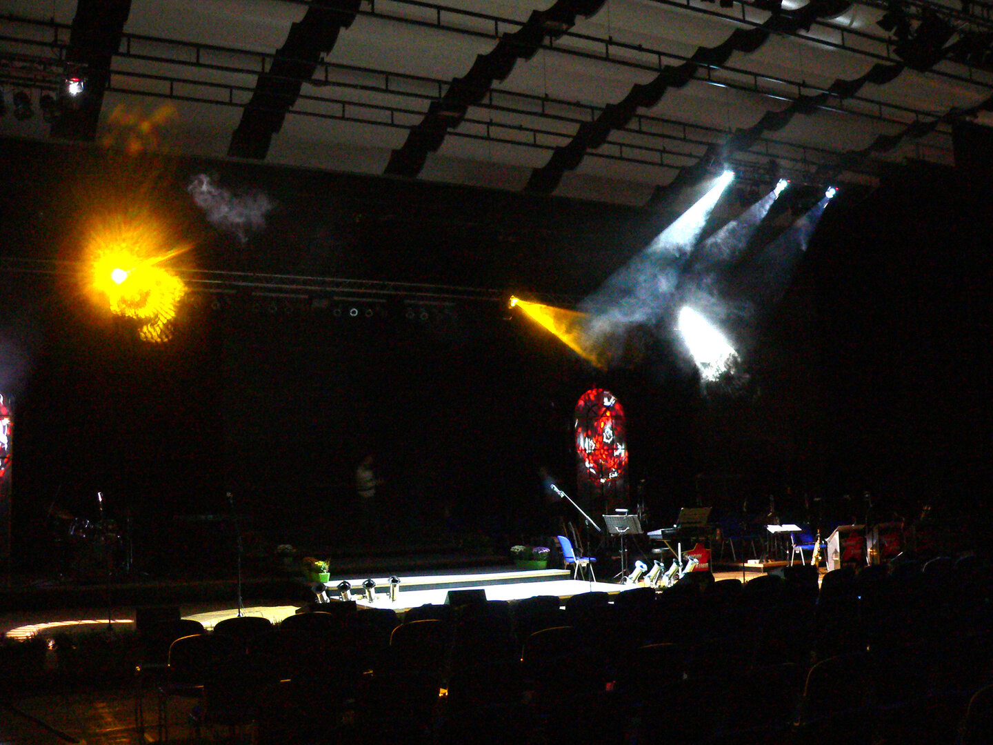 Als Kamera diente mir damals die analoge Spiegelreflexkamera RICOH TLS 401. Fotografieren konnte ich nur von meinem Sitzplatz im mittelern Rand im Kuppelsaal. 200'er Tele, spezieller ILFORD Film konnte mit umgerechnet ISO 1000 belichtet werden. Zeit 1/30 sec, Blende 6 und dann gaaaanz ruhig halten. Der Schwarz/Weiß-Film wurde dann zu Hause in der Küche mit einem hochempfindlichen Spezialentwickler für die Vergrößerung auf ILFORD-Fotopapier vorbereitet.